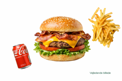 Bacon cheeseburger med oksekødsbøf, kalve bacon, ost, salat, tomat, syltet agurk, løg og burgerdressing. Serveres med pommes frites og en valgfri sodavand.
