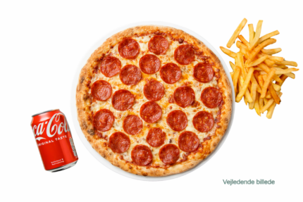 Valgfri pizza med pommes frites og en valgfri sodavand.