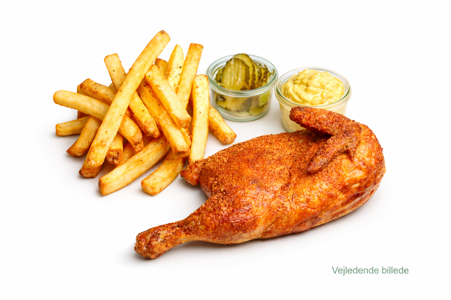 Med salat, pomes frites og remolade.