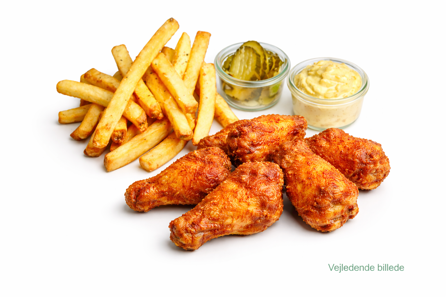 Med salat, pommes frites og remolade.